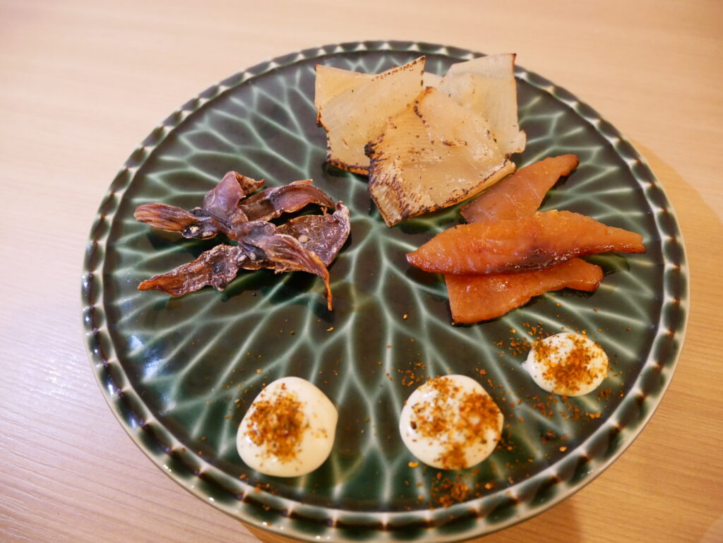 たからやま醸造の清酒に漬けこんだ珍味(ホタルイカ、エイヒレ、鮭とば)と一緒に締めくくりました。
