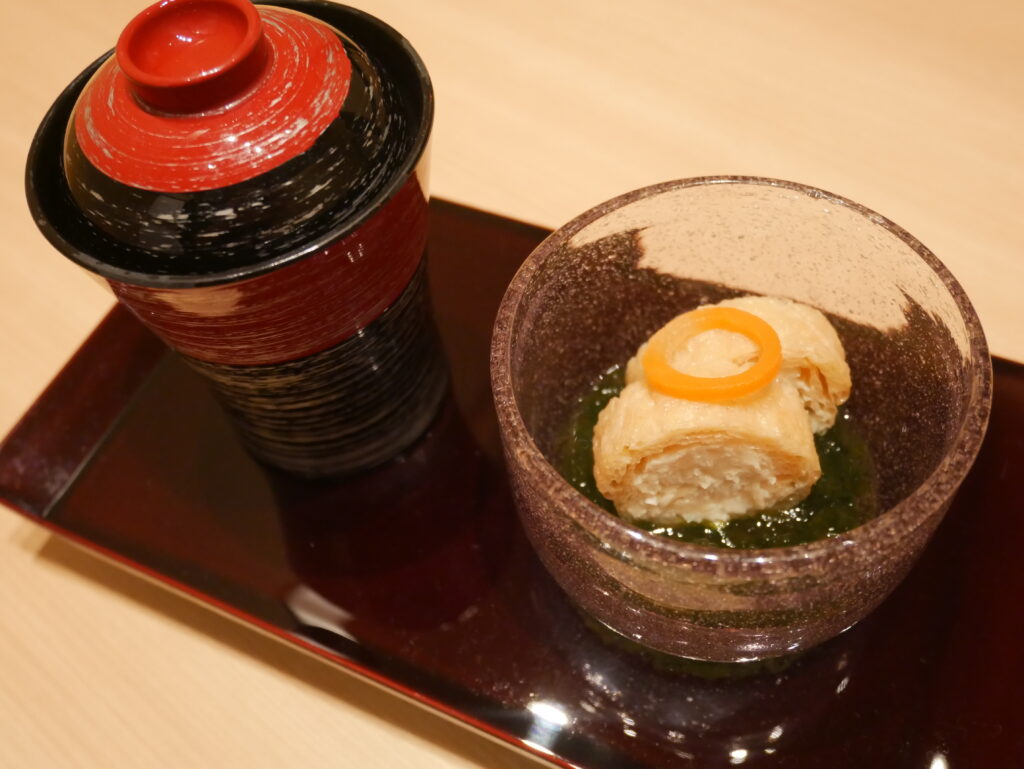【先附】筍の信田巻き磯辺あん、小吸椀(蛤汁仕立て)