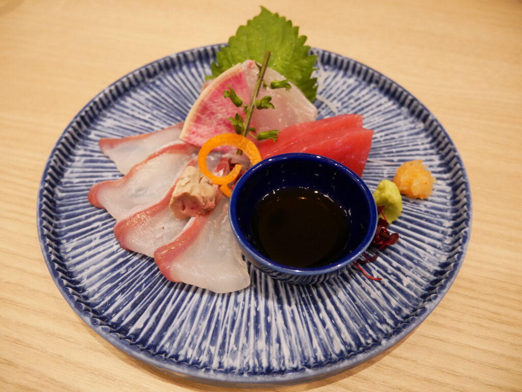 御造りはハタはポン酢と肝を一緒に、カンパチとマグロは和院醤油でお召し上がりいただきました。