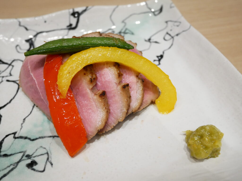 鴨肉によく合うということで、今回は料理長が合鴨ロースを山椒の効かせたタレで焼き上げました。